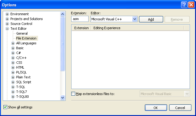 This won't happen automatically, but you can create a syntax definition file named Usertype.dat that contains MASM keywords. Then when Visual Studio starts, it reads the syntax file and highlights MASM keywords. If you decide to use Visual Studio's built-in MASM syntax highlighter, here are the required steps to set it up: 1) Download this Usertype.dat file (enclosed in a ZIP file) given here to a folder in which you have read/write permissions. Extract it from the zip archive. 2) Close Visual Studio. 3) Copy Usertype.dat to the C:\Program Files (x86)\Microsoft Visual Studio\2019\Community\Common7\IDE folder. Windows will display a confirmation dialog before copying the file. 4) Open Visual Studio, select Options from the Tools menu, select Text Editor, and select File Extension. On the right side of the dialog (shown below), enter asm as the extension, select Microsoft Visual C++ from the Editor list, and click the Add button. Click the OK button to save your changes.